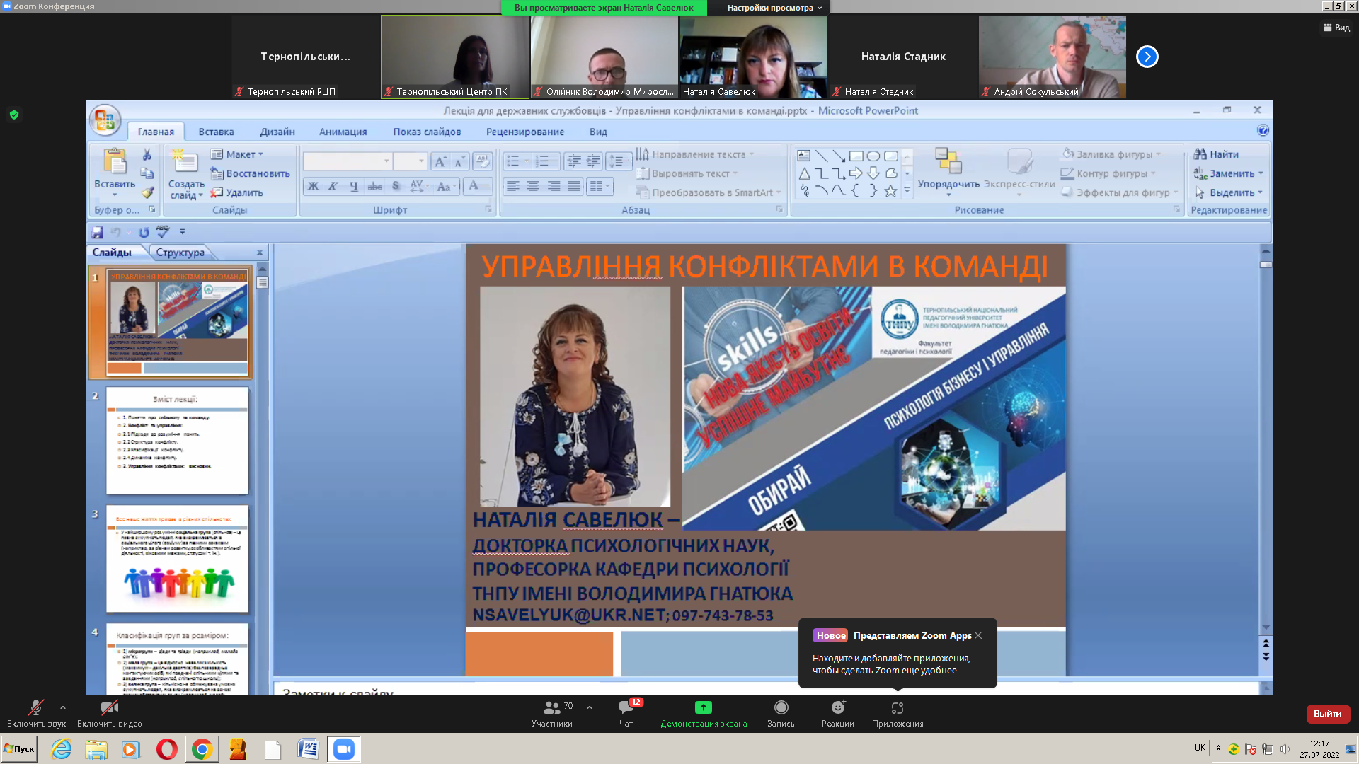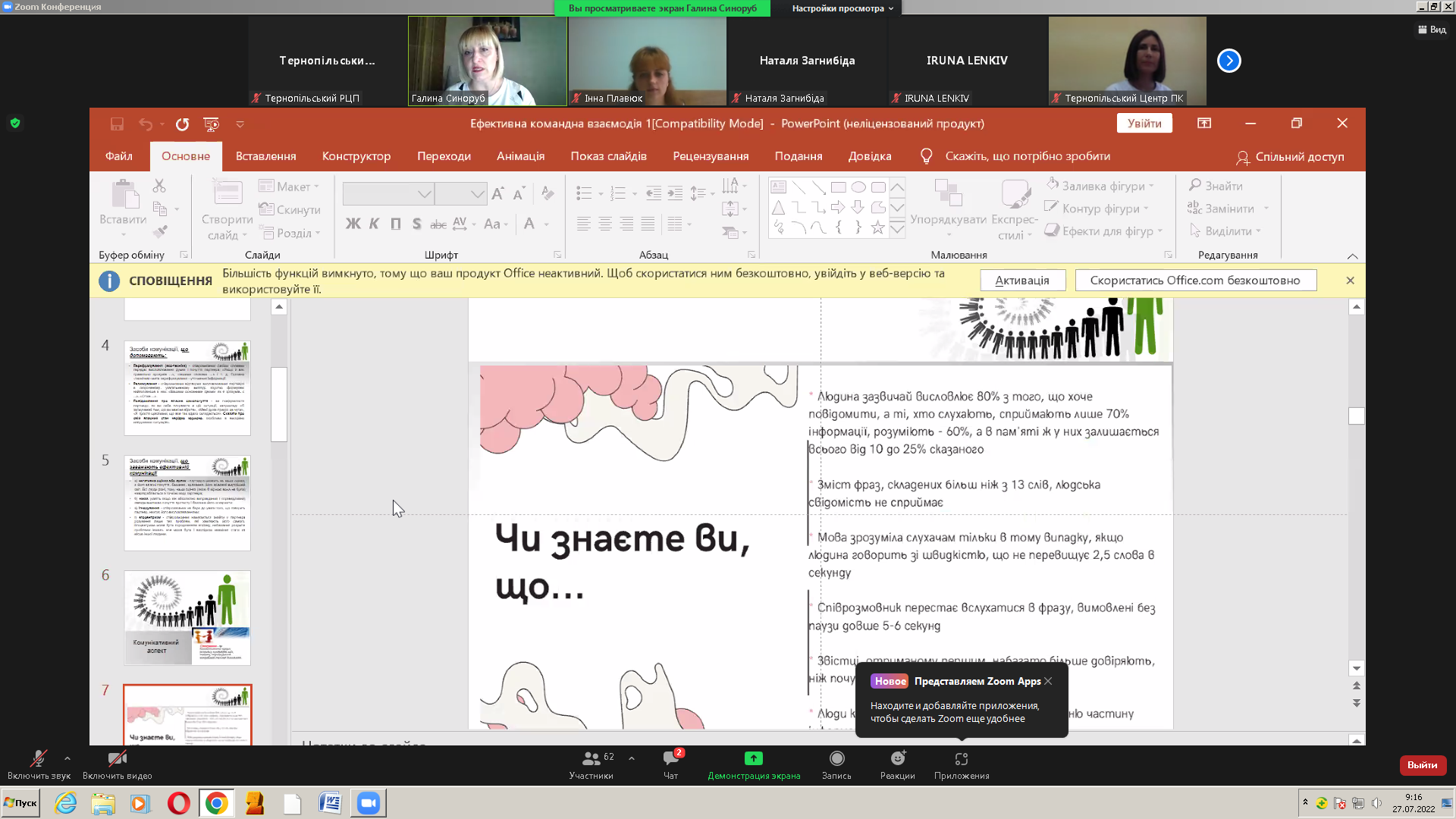 27 липня 2022 р. відбулося онлайн – навчання державних службовців категорій «Б» та «В» та для посадових осіб місцевого самоврядування IV-VII категорій посад за спеціальною короткостроковою програмою «Ефективні комунікації, взаємодія в публічному управлінні». Перед слухачами виступили Синоруб Галина Петрівна – кандидат наук із соціальних комунікацій, доцент кафедри журналістики Тернопільського національного педагогічного університету ім. В.Гнатюка, Блашків Ольга Володимирівна – кандидат філологічних наук, доцент кафедри документознавства, інформаційної діяльності та українознавства Західноукраїнського національного університету, Савелюк Наталія Михайлівна – докторка психологічних наук, професорка кафедри психології Тернопільського національного педагогічног університету ім. В.Гнатюка та Свідерська Галина Мирославівна – кандидат психологічних наук, доцент кафедри психології розвитку та консультування Тернопільського національного педагогічного університету ім. В.Гнатюка.