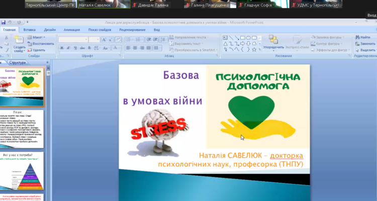 Перед слухачами виступили Савелюк Наталія Михайлівна – докторка психологічних наук, професорка кафедри психології Тернопільського національного педагогічного університету ім. В. Гнатюка, Свідерська Галина Мирославівна – кандидат психологічних наук, доцент кафедри психології розвитку та консультування Тернопільського національного педагогічного університету ім. В. Гнатюка, Кізь Ольга Богданівна – керівниця Центру ґендерних досліджень та впровадження політики рівних прав і можливостей Тернопільського національного педагогічного університету ім. В.Гнатюка, кандидатка психологічних наук, доцентка кафедри психології, тренерка Програми рівних можливостей та прав жінок в Україні ПРООН, Блашків Ольга Володимирівна – кандидат філологічних наук, доцент кафедри інформаційної та соціокультурної діяльності Західноукраїнського національного університету.